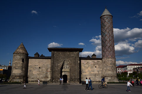 Celle-ci, c'est une autre madrassa, l’École Coranique aux Minarets Jumeaux (Çifte Minareli Medrese), qui est plus ancienne puisqu'elle date de 1275-1276. Et là, pas de discussion, on connaît sa date de construction parce que la plaque apposée lors de son édification est encore là. Et pour lever tout doute sur ses commanditaires, tu peux voir ci-dessous, sculpté de chaque côté du portail, l'aigle bicéphale seldjoukide posé sur l'arbre de vie sous lequel deux lions se font face. Un détail : l'aigle seldjoukide est ci-dessous à gauche ; ci-dessous à droite, à l’intérieur de la madrassa, ce n'est pas un aigle, c'est une grosse dame en noir et tu dois pouvoir faire la différence en observant bien : l'aigle a deux têtes, la dame n'en a qu'une.